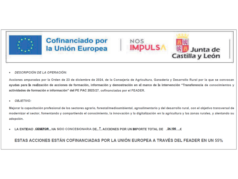 A continuación se listan los cursos gratuitos organizados en 2025 por la Fundación Cesefor en el marco de la convocatoria “Transferencia de conocimientos y actividades de formación e información” del Plan Estratégico Nacional de la Política Agrícola Común de España 2023/2027, cofinanciadas por el FEADER.